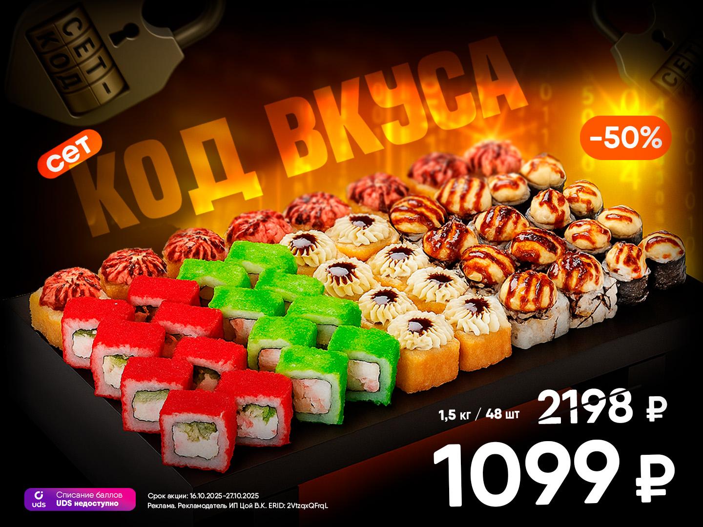 1,5 кг топовых роллов по крутой цене - всего 1099 ₽ [emoji=:heart_eyes:][br]Никаких компромиссов: только мощный набор вкусов, идеально выстроенный баланс и порция, которой хватит на компанию.[br]Ты знаешь, что выбирать [br][br][emoji=:collision:] Сет “Код Вкуса” — 1,5 кг за 1099 ₽.[br]Взломай систему. Заказывай в «Суши Даром» прямо сейчас [br][br]Срок действия акции с 16.10.2025-27.10.2025[br]*Списание баллов UDS невозможно.[br]**Количество товара ограничено, наличие товара уточняйте у кассира по телефону 8 (923) 313-85-27
